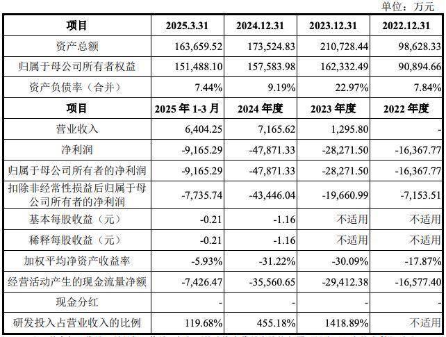 截至报告期末,公司尚未盈利且合并报表层面的累计未弥补亏损为7.82亿元。2022年~2024年及2025年一季度(下称报告期内)归属于母公司股东的净利润(扣除非经常性损益前后孰低)分别为-1.64亿元、-2.83亿元、-4.79亿元及-0.92亿元。
