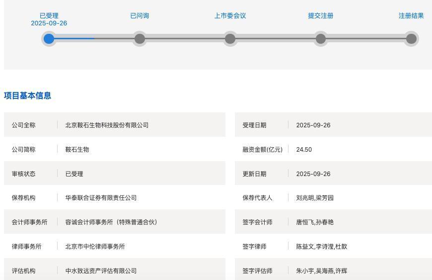 上交所官网显示,2025年9月26日,北京鞍石生物科技股份有限公司(下称“鞍石生物”)公开发行股票并在科创板上市的申请已获得受理,同时披露了招股说明书(申报稿),保荐机构为华泰联合证券有限责任公司,IPO融资金额为24.50亿元。